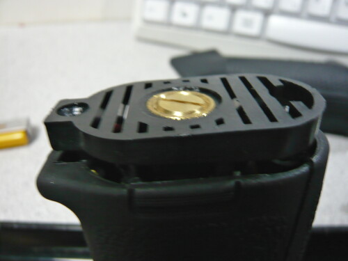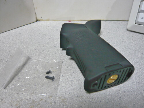 グイッと押し込んで前後のネジを締めます。標準のグリップは前が短いネジ/後ろが長いネジでしたが、このMIADグリップは前が長いネジ/後ろが短いネジでした。前側に短いネジを差してもネジの長さが底プレートの厚さ分くらいしか無いので長いネジでしか留まらないようになっています。底プレートがグリップの底面とツライチになるまでしっかり締めておきます。当然締めすぎは厳禁。