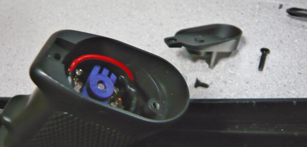 配線を繋いだらグリップ底のプレートを被せますが、モーター後端の形状にキッチリ合うように被せます。配線が邪魔をする場合はかき分けるようにしてグリグリと合うまでしっかり噛み合わせます。グリグリしすぎると配線の端子が抜けるのでやりすぎないように。元のグリップの底に挟まっていた丸い金属プレートは取り付けるグリップによって要る場合と要らない場合がありますが、グリップ底に付くプレートの中心にあるモーター位置調整ネジのモーター側の面が平らな場合は要らず、イモネジなどがむき出しで尖っている場合(マルイM4標準グリップなど)は必要。