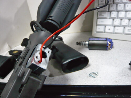モーターを差し込みます。プラス端子のある方を前方(上画像だと下側)にします。マルイのモーターならプラス端子のそばにある丸い部分が赤マジックのようなインクで塗られているので分かり易いですが、塗られていないモーターでもモーターの軸を覆うプラパーツに「+」と書いてあったりします。