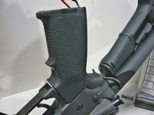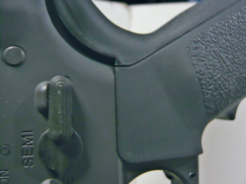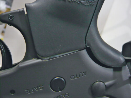 干渉する部分をちょっと削ってやります。カッターでちょいちょいと上画像のように。このぐらいで十分。Magpul PTSのMOEグリップなどは元々ここが窪んでいるので加工の必要はありません。