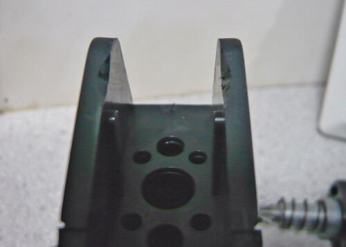こちらはちゃんとガスチューブを固定するピンを差し込む横穴が開いています。この穴の存在と、QDスイベル穴が黒か銀かで見分けられるかと思います。あちらは半光沢のパーカーグレーでしたがこちらは黒。角もあちらよりは立っています。