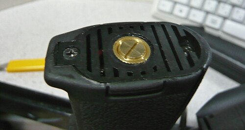 底プレートをネジ留めしたらバッテリーを繋いで軽く空撃ちして異音がしないか確認します。グリップ底の金色の真鍮ネジをマイナスドライバーでちょっと回して撃ちちょっと回しては撃ちを繰り返して異音の出ない位置を探ります。異音とはいわゆるギヤ鳴きで、ギャーとかキャーとかいう感じの音。どんな音かわからない場合は金色ネジをいっぱいに締めたり外れる直前まで緩めたりするとどこからかで鳴り出します。が、大抵買ってきた状態のままポン付けしても大体丁度良い位置になっている事が多いです。