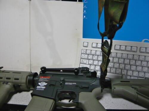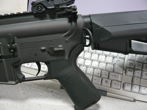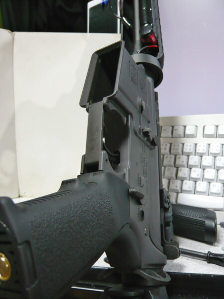 一方、グリップとトリガーガード、ストックをノーマルに戻されたマルイスタンダードM4。ハンドガードはCM16についていたもので、リアルサイズ化済みなので取り付けはできるのですがデルタリングのスプリングテンションが強くて着脱は一苦労。でもマルイM4のグレー味の強いパーカー色のレシーバーにはFGカラーより黒いパーツが映えます。