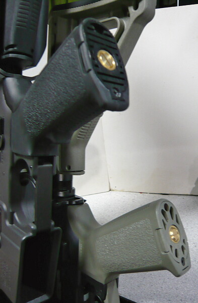 G&G CM16に取り付けたMagpul PTS MOEグリップとのツーショット。握った時の形状的な差はほとんど無いのですが、触った感触には若干の差異がみられます。Magpul PTSのMOEグリップは硬質でザラッとした手触りの中にひんやりとした冷たさがあるのですが、MIADグリップキットレプリカの方はこのひんやり感が無く、硬さもほんの僅かに柔らかい印象。材質に若干の違いがあるのかどうなのかはわかりませんが、さすがに値段なりの高級感の差はあります。とはいっても銃を持つ時常に触れる部分であるグリップですから、ダメなものはすぐにダメだとわかるパーツでもあります。その点においては「必要十分」という評価を下せるでしょう。また、グリップは人によって好みが全く違うパーツでもあるので誰かが良いと言っても自分にとっても良いとは限りません。
