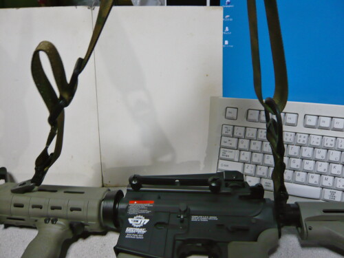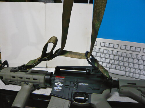 G&GのCM16に装着し、3点で吊り上げているところ。3点は慣れるまではちょっとこんがらがりそうになりますが慣れてしまえば非常に安定して銃を保持する事ができるようになります。上画像の持ち上げている輪っかに首と左腕を通し、右肩に掛けるようにします。銃をぶら下げた状態から素早くストックを右肩に当てて狙う事ができます。