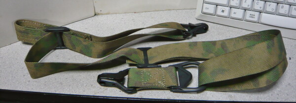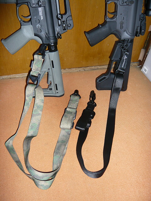 MS2スリングレプリカとのツーショット。両方ともMagpul Dynamicsというブランドのものです。MS3のスリングは幅広な分首の辺りでねじれていると気持ち悪いのでちゃんと掛ける必要がある感じ。このMS2のスリングは生地がすべすべで大変さわり心地が良く、買った当初は何か磯臭かったりして微妙な目で見ていたのですが今ではお気に入りのスリングです。これに較べると今回のMS3スリングは生地がちょっと硬い(比較であって、これ自体は割りと柔らかい方ではあります)ので、こなれてくれば良いスリングになると思います。これより安いスリングはたくさんありますが、この2つほど良いものはあまり無い印象を受けます。もちろん好みもありますので人それぞれですが、コストパフォーマンスの高いスリングです。