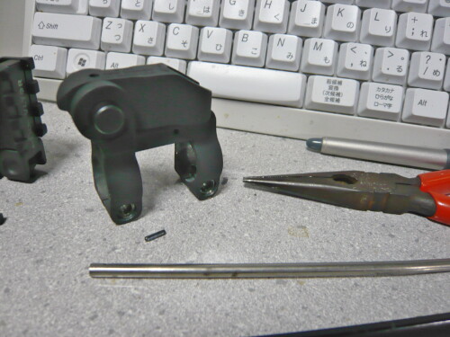横から刺さっているピンを抜き、ガスチューブを取り外します。ピンは横からポンチでつついてやればすんなり外れました。
