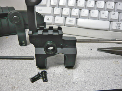 それでは早速取り付けてみましょう。まずはすでに取り付けられているフロントサイトポストを外します。G&PのSPRタイプフリップアップサイトが取り付けられていました。これも質感とか操作感とか結構良いモノなのですが、機能的には折りたためる以外に特に無いので予備サイトみたいな扱い。