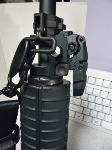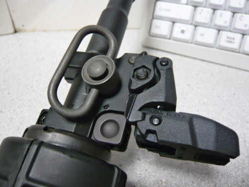 倒したところ。上面のレイルがアッパーレシーバー上のレイルと同じ高さになるのがこのフロントサイトの一番の特徴といえるかもしれません。フリップアップじゃなくレイルだけのフロントサイトポストだとレシーバーのレイルと同じ高さになるやつが無いんですよね・・・理由は多分こういうフロントサイトをつける人はすでにハンドガードを上面レイルのあるRISとかに換えてるから?私は金属製のハンドガードは好きではないので・・・(バッテリー入らなくなるし)