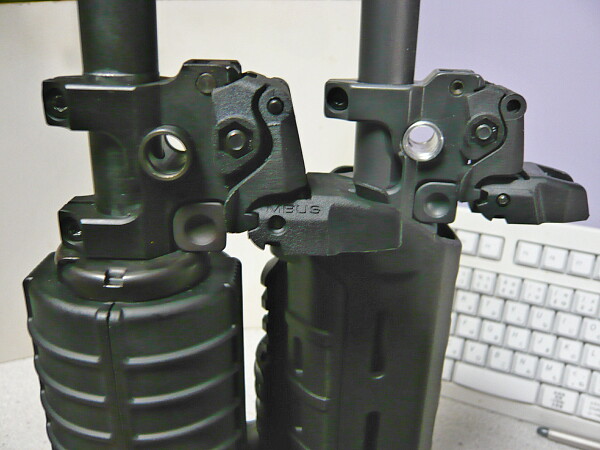 MOEハンドガード(カービンレングス・旧型)はポン付けOK.。ただロワ側は若干締まりが弱く、下に取り付けているRVGを掴んで揺するとちょっとグニャグニャします。ガッチリさせたい場合デルタリングセットを替えた方が良いでしょうが、その代わりに着脱が面倒になります・・・ハンドガード上面形状やロワ側の横穴の向きが違う新型MOEハンドガードはこの旧型とは取り付け部分の寸法が同じハズなのでそちらも問題無く取り付くでしょう。旧型は上面が平らですが新型は山型になっており、ロワ側の横穴が旧型は横方向、新型は縦方向に抜けています。
