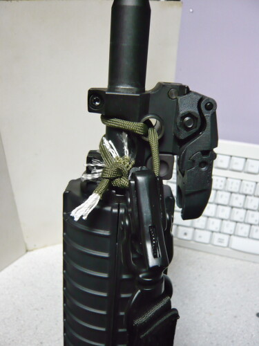 1点で吊り上げているところ。レシーバーにスリングスイベルが無いと使いづらいし肩から下げている時銃がブラブラしますが取り回しの自由度が高いのが特徴です。ストックが無いサブマシンガンなどでは左肩にたすき掛けした状態からスリングを突っ張らせる事で銃を安定させ、ストックの代わりとする事ができます。