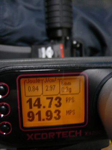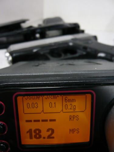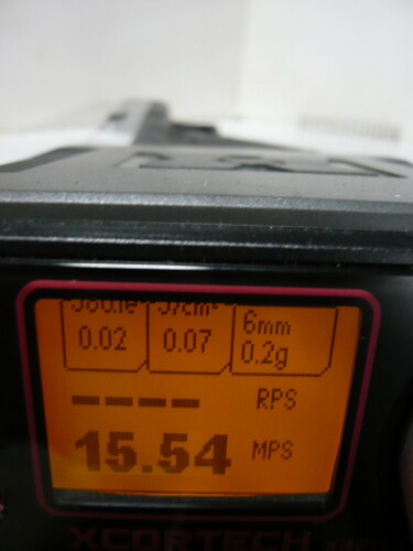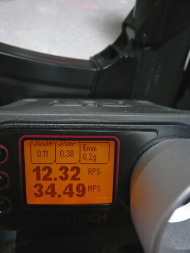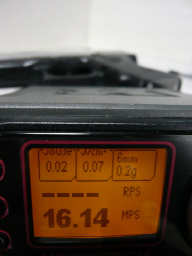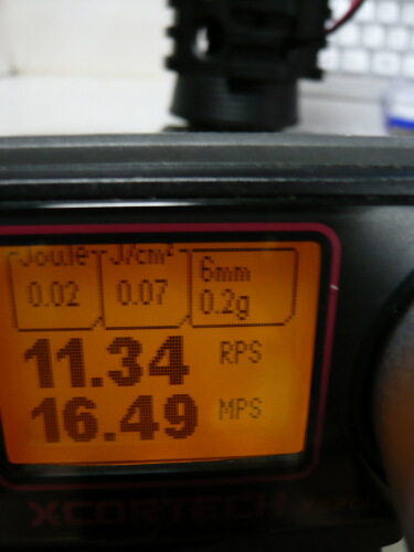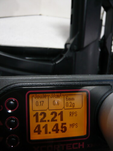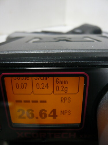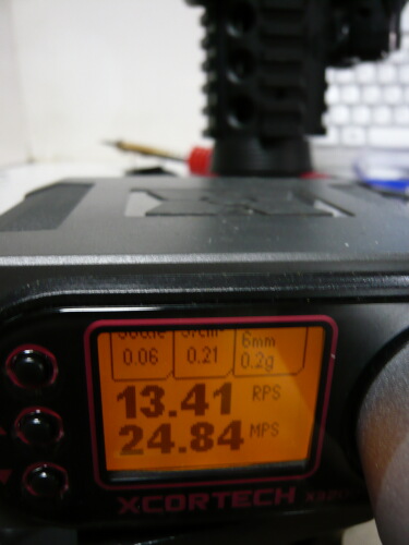 スプリングとバレルを組み込んだ後の初速。サイクルはほとんど変わらず、初速は30~35mpsから40前後に向上。向上、つっても微々たる差やなぁ・・・