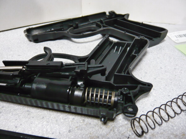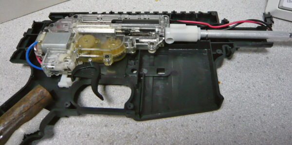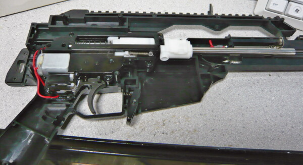 トリガーを引くと連動してピストンが引き縮められ、引ききるとピストンがスプリングの力で前進、BB弾を発射する機構です。トリガープルは普通のダブルアクショントリガーくらいの引きしろと、むしろ軽いくらいの重さなのでちょっとくらい重くなっても不便にはならないだろうと、