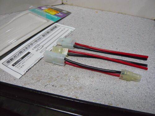 マルイのコネクターセット。ラージコネクタオスメスとミニコネクタオスメスがあり、配線が組まれている状態。変換としてはラージ仕様の銃にミニバッテリーを接続するアダプターと、片側だけのラージ/オスとミニ/メスという構成。ミニバッテリー仕様の銃にラージバッテリーを繋ぐのにはそのままでは使えないので注意。