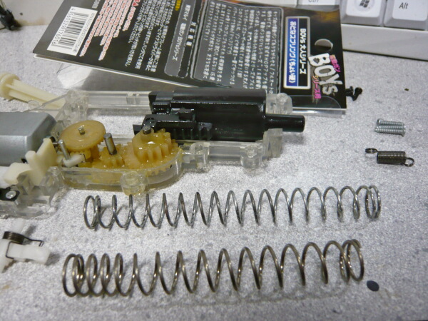 スプリング径の太さは許容範囲で、ちゃんと組み込めはするのですがメカボックス単体で空撃ちしてみるとサイクルが速いです。つまり明らかにレートが低く、初速は落ちているはず・・・