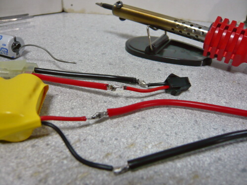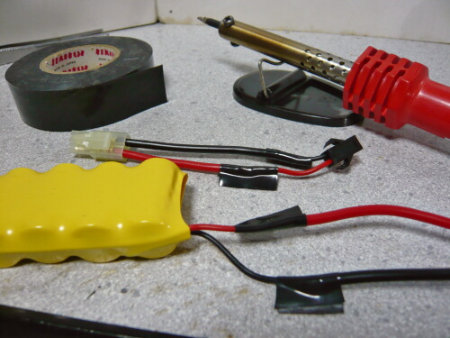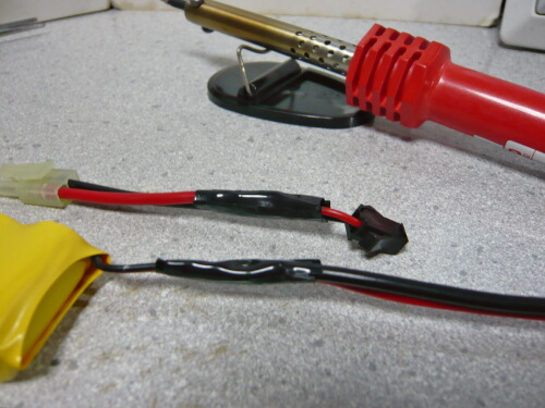 付属のバッテリーの配線をちょん切ってバッテリーにミニコネクター/メスを、ちょん切った先にミニコネクター/オスをハンダ付けします。このために昨日ムサシにハンダごて買いに行ったっての・・・