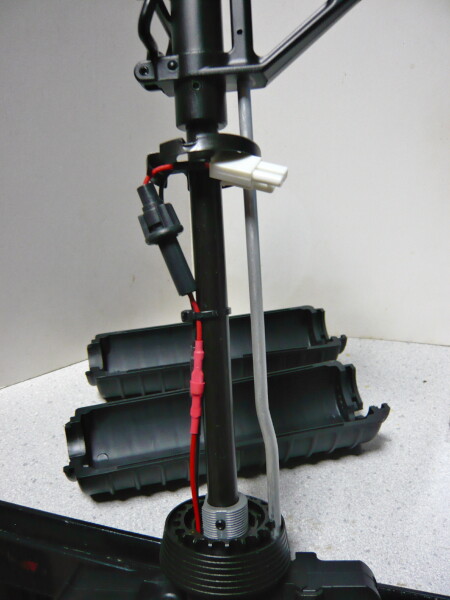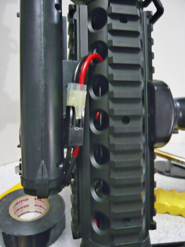 電池ボックスの後ろに来る配線は上側の赤い配線はその場で余った分をまとめますが、黒い配線は通る道が決まっており、上側からインナーバレルの脇を通り下側で余った分をまとめます。