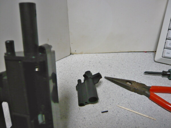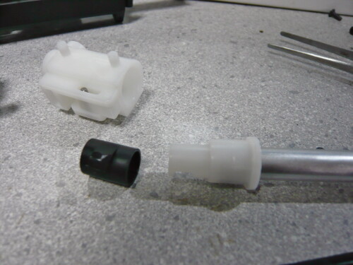 チャンバーは固く差し込まれておりちょっと苦労。インナーバレルとチャンバーを掴んで引っこ抜くとまず上画像のように分離。黒い筒はチャンバーパッキンです。インナーバレルが刺さっている部分はかなり固く、白い樹脂パーツの下にラジオペンチを当て、その下を掴んで手の指を挟むようにテコの原理で押してやっと抜けました。