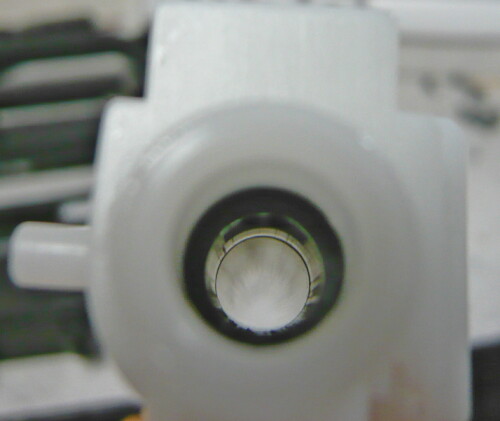 チャンバー側からインナーバレルを覗いたところ。上面にホップアップを掛けるゴムの突起が突き出ており、中央が切り欠かれ2箇所でホップを掛ける構造。