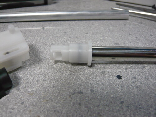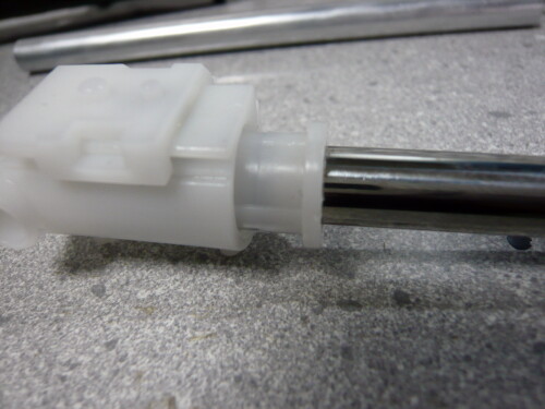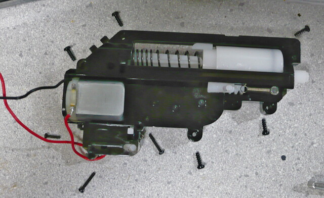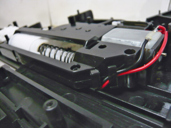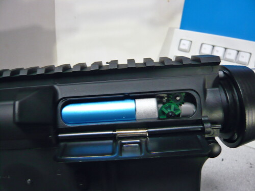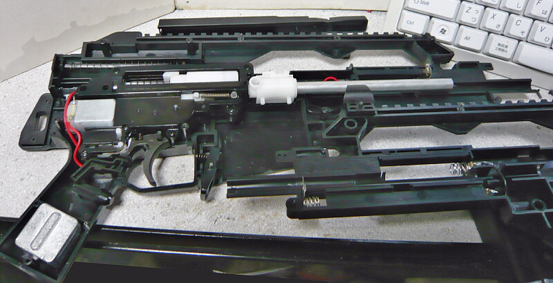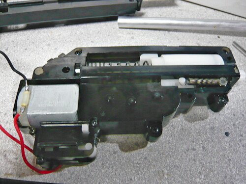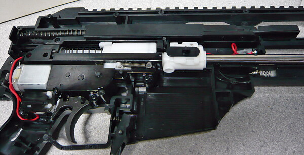 強化スプリングとはいえ所詮緩いバネなので組み込みは簡単。ピストンの横に突き出た部分をレールに掛けるのを忘れずに。