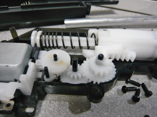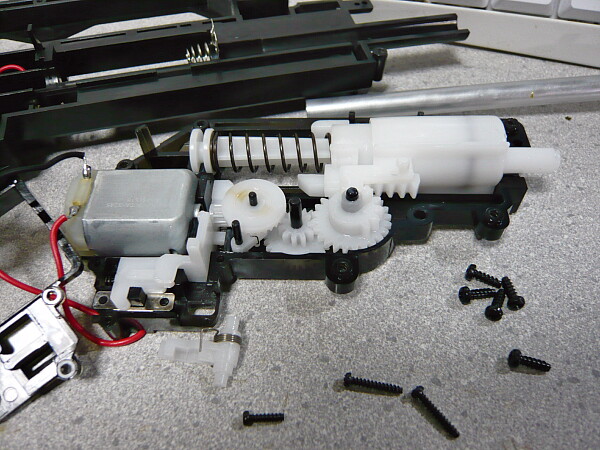 メカボックス右側のシリンダーの下に掛かっているスプリングの片側をはずしておきます。メカボックスに掛かっている側はカシメられているので取り外す事はできません。スプリングを外したら見えるネジを全て外しモナカを開けます。メカボックスのネジはこちらの方が太くて高品質のタッピングビスで、短くて太いものが5本、長くて細いものが2本、短くて細いものが1本。メカボックスの内部もやはりそっくりですがこちらはギヤが真っ白いです。