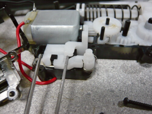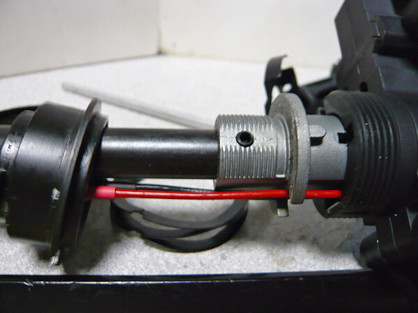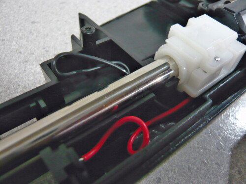 話がそれましたがメカボックスをモナカに載せる時は配線をメカボックス後端の上側ラッチには掛けず、上画像のようにシリンダーの横辺りに通します。上へ出してしまうとチャージハンドルに干渉してしまいます。ひっかけ問題に騙されないように。