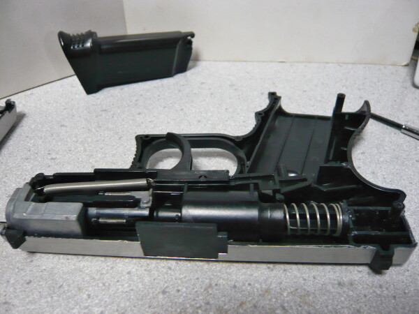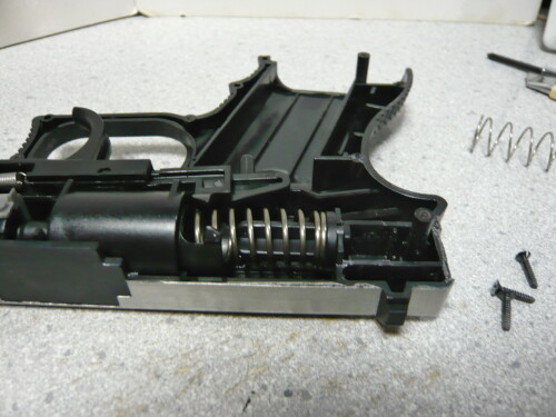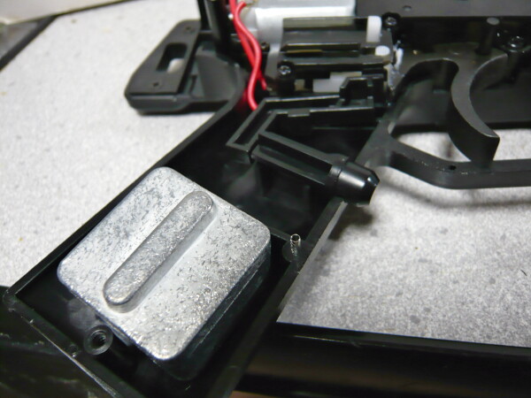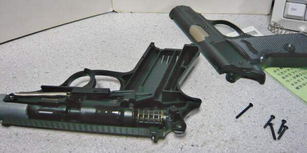 おっとまだ残っていました、グリップセーフティのパーツを忘れずに取り付けます。銃をより軽くしたい人はグリップ内の重りは外してしまうと良いでしょう。