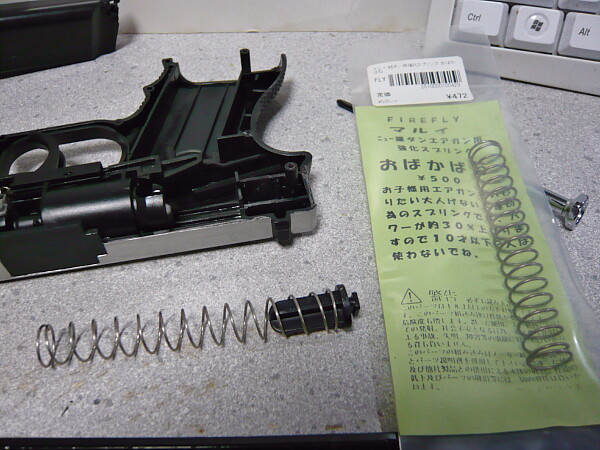 結局1割ほどしか初速アップしないおばかばね。酔狂な方に。銀ダンにどんな強烈にレートの高いスプリングを入れたところでシリンダー容積が小さいため30mpsを越える事はありません。おばかばねより初速アップさせたいなら10歳以上用のエアコキからスプリングをコンバートする手段もある、という事も一応報告しておきます。