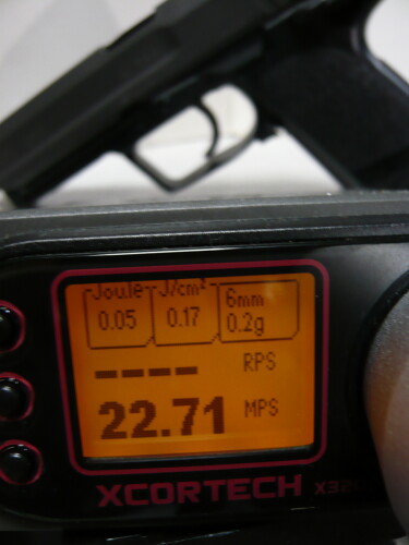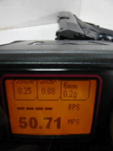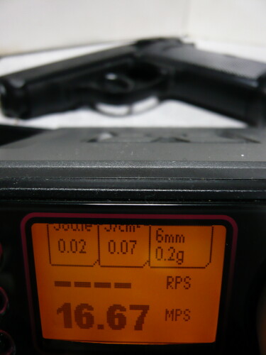 銀ダンはもう1挺リアルフィニッシュのPPK/Sがあるのでこちらにでも入れておきましょうか。一応ノーマルで計測。普通の銀ダンとリアルフィニッシュ銀ダンは対象年齢が違うのでリアルフィニッシュの方が若干初速が高くされていrます。