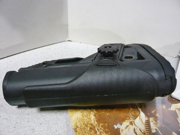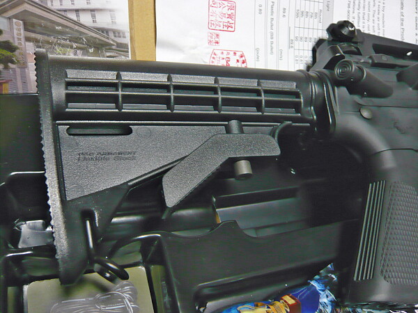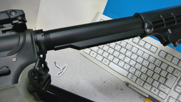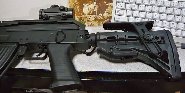 チークパッドを持ち上げると形状的なバランスが取れるかな?M4系に装着する場合はチークパッドは外した方がいいかも。ストックチューブの太さへの対応具合は、この銃のストックチューブに入るなら大体どれでも丁度良いかな?標準状態が割りとガタガタなのに対し、今回のストックではガタが大分軽減しています。そういやこの銃への各ストックの適合は試してなかったな・・・