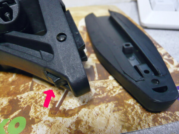 左右にあるネジを緩めるとチークパッドが上下に可動できます。マグプルのCTRカービンストックなどにチークライザー装着だとM4系のチャージハンドルと干渉しますが、こちらはそんな事もありません。高さも無段階調整。このチークパッドは下の方にあるネジを外せば取り外す事も可能。元々このチークパッドはオプション品のようです。ネジの後ろにある穴はQDスイベル穴。ちょっとロック位置が浅い気もしますが、すっぽ抜けたりはしません。