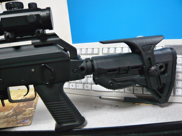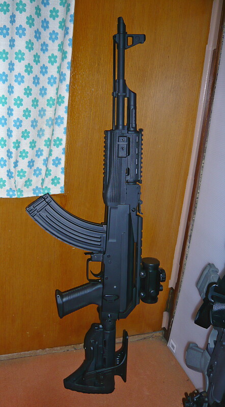 AK47タクティカルの場合ドットサイトをレイルに載せているとチークパッドを一番上まで上げた状態で丁度良く頬付けして覗く事ができます。真っ黒でゴテゴテしたAK47タクティカルと見た目の親和性も高いかと思います。レバーは慣れているのと逆なのでちょっと戸惑います・・・