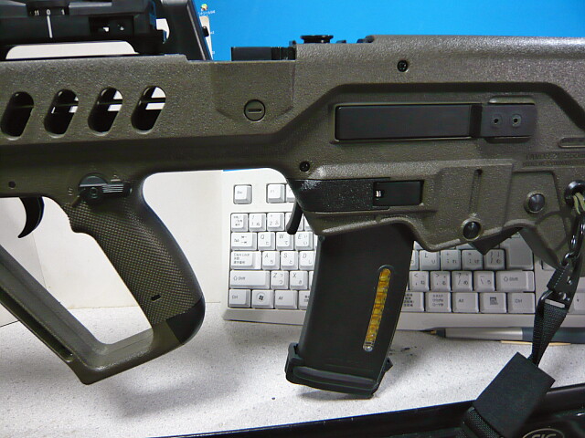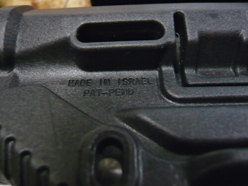 MADE IN ISRAELの文字がありますが、ノーブランドレプリカなので実際イスラエル製かどうかは不明。レプリカ元はイスラエルでデザインされたもので、単に形状だけではなく反動軽減のためにスプリングを内蔵しています。このレプリカは機能までは再現されていませんが下側にあるレバーの隙間から青いスプリングが見えます。