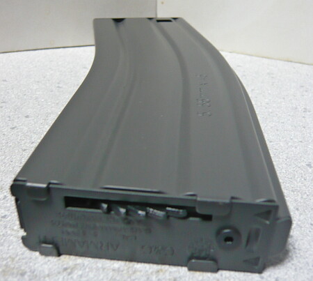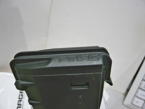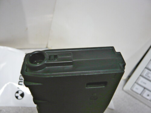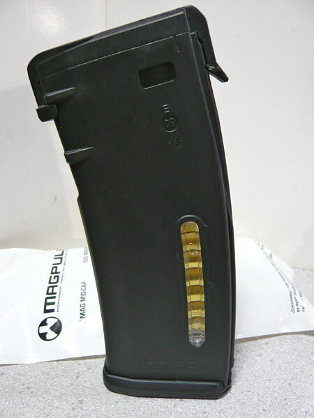 リブが無くつるりとした側面に細長い窓があり、中の薬莢が目視できるので残弾の確認がしやすいのがE-MAGの特徴。ただしこのE-MAGはエアーソフトガン用なので関係無いですけども。このE-MAGは最新型のE-MAG DWなので左右両側に窓がありますが、古いものは片側にしか窓がありません。他、P-MAGに窓が付いた75連のものもあるので買う時は注意が必要です。