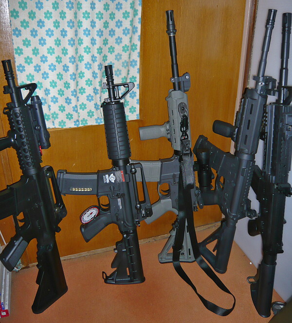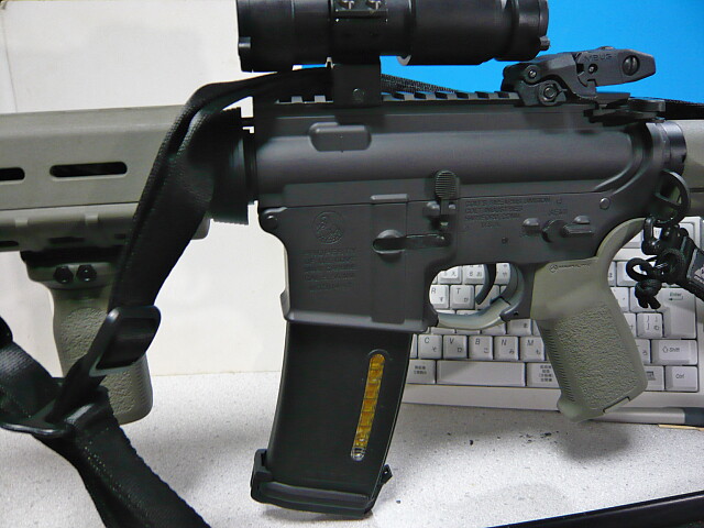マルイのスタンダード電動M4A1カービンに装着。今更なれど、色がチグハグだわ・・・ちょっと刺さりが渋いものの、個体差なのでしょう。