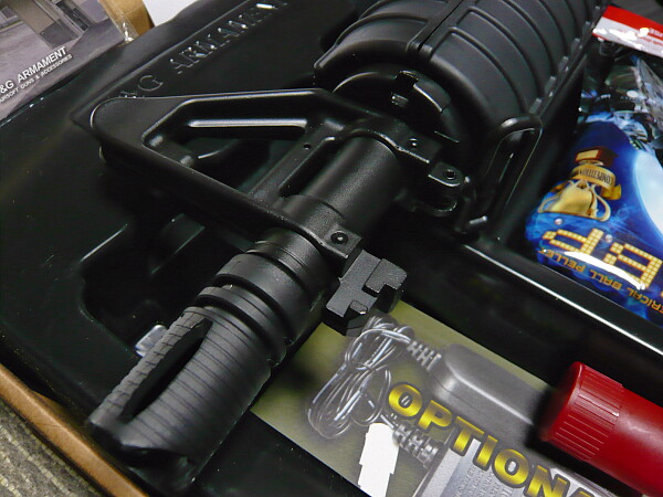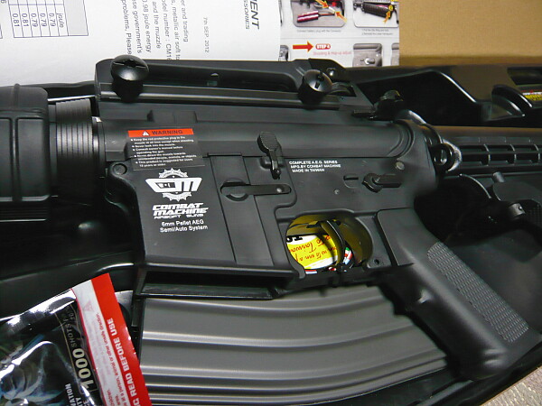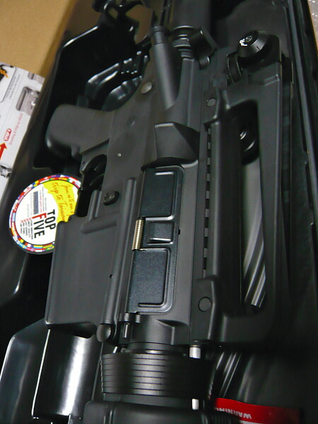 レシーバー付近。アッパー/ロワレシーバー、キャリングハンドル共に基本はプラ製。他グリップやハンドガード、ストックもプラ製ですがそれ以外は金属製。安っぽさはあまり感じられず、中々良い雰囲気。あ、ボルトフォワードアシストノブもプラ製ですね。色はつや消し黒ですがプラ部分と較べると微妙~に青っぽい気がする風合い。ロワレシーバー左側面には白い印刷があります。表記はトイガン丸出しですが、これは好み次第。アッパー/ロワレシーバーを繋ぐようにステッカーが貼られていますがこれは封印でしょうか?マルイ製の電動ガン同様に素人が安易にバラさないようにする意図があるものでしょう。
