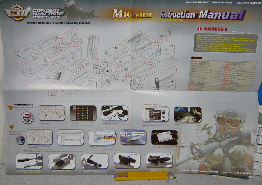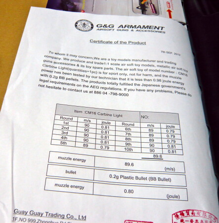 初速証明書。大体90mps前後。スタンダード電動ガンの標準初速といえます。この証明書も説明書も全て英語表記なので書いてある事はチンプンカンプンですが、まああまり気にするところではないか。大体わかりゃ十分。