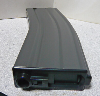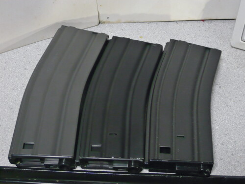 左からG&G CM16マガジン(450連)/S&Tタボールマガジン(300連)/マルイスタンダード電動M4マガジン(ノーマル)。マルイ製の多弾マガジンは300連でタボールのものもこれに準じますが、G&G・CM16標準のものは長さが伸ばされて容量が増えています。外装はスチールプレス製でタボールのもののように雑な造りだったりもなく、このマガジンを他のマルイスタンダード電動M4互換マガジン仕様の銃に使う事もできそうです。