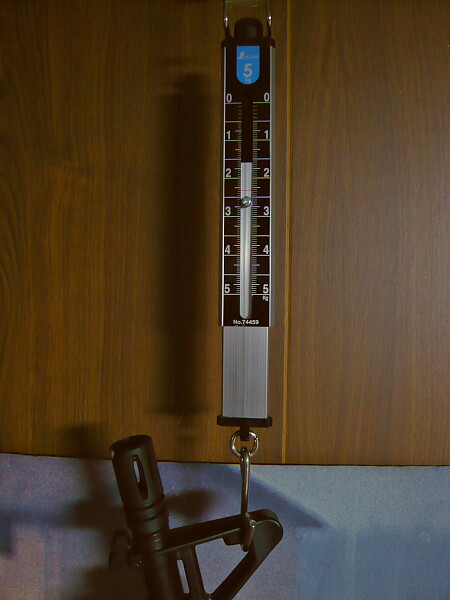 バネ秤を買ってきたので重量も測ってみましょう。アナログで簡易な構造のぶら下げ型の秤で最大5kg、1800円くらい。引っ掛ける所さえあれば大概のものは測れますが、ちょっと目盛りが大雑把。台に載せて測るタイプの秤は5千円からとちょっと高いし、安いものは2kgまでのものが多いです。バッテリーを外してレイルにドットサイトを載せている状態で4.4kgほどあり、ウチにある銃の中では最も重い銃です。