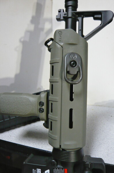 リアルサイズという事はこのようにマグプルMOEハンドガードがポン付けできてしまいます。取り付けは前側をハンドガードキャップにハメてから後ろ側をアウターバレル付け根のギザギザにハメ込み、デルタリングのスプリングテンションでロックします。デルタリングのスプリングがちょっとヤワすぎる感じがありますが、G&PのGP123デルタリングセットのスプリングはテンションが強くて着脱がしんどいのでちゃんとロックできさえすればヤワい方が楽。