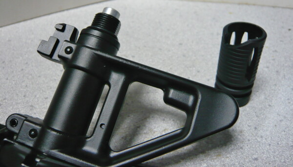 マルイのラインナップでいうとコルトM933コマンドに相当。アウターバレルは金属製でフロントサイトポストも金属なのですが、アウターバレルとフロントサイトポストは一体化しておりそのまま別のフロントサイトに交換とはいかないようです。フラッシュハイダーはプラ製。ハンドガードの前側を保持するハンドガードキャップは金属製で、アルミっぽいガスチューブが貫通してフロントサイトポストの後ろに刺さっています。