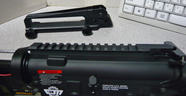 キャリングハンドル左側のネジを緩めるとレシーバーから分離できます。その下にあるレイルはプラ製。レシーバーと一体なのでたわんだりもなく、これはこれで十分なのでは。