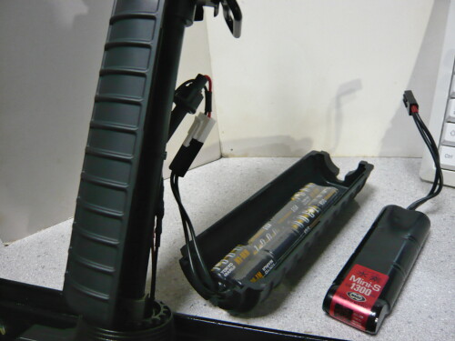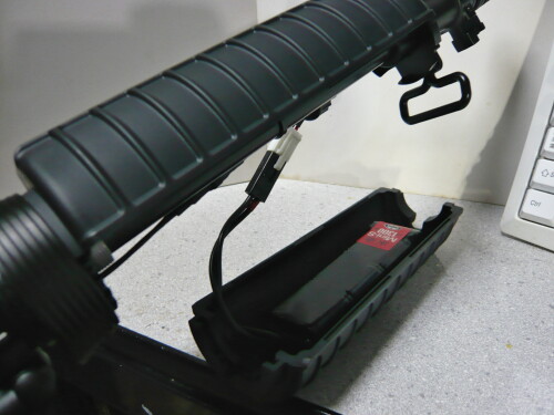 前方右側の穴から出して接続すると見苦しくなくて収まりが良いかな?バッテリーボックスにはマルイのニッケル水素8.4VミニSバッテリーが入っており、無加工で利用できます。
