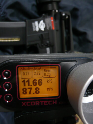 初速チェック。8.4vNi-MHで12rps程度、初速は87~92mps程度。発射音はマルイのM4と似ていますがややバイン、バインと響く印象。