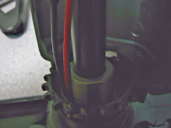 ストックチューブの通る部分を後ろ側から覗いたところ。わかりにくいですが、手前左側のQDスイベル穴が貫通してきた部分に盛大なバリが出ています。ストックチューブに差し込む前に削ってやりましょう。