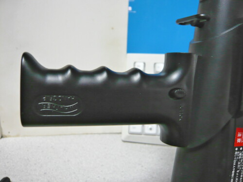 フォアグリップは左側にあるスイッチを下へスライドさせるとレイル面にあるロックが下がる簡易ながら必要十分なもの。前面にはフィンガーチャンネルもあり、レイルとのガタも少なめで割と使えるものになっています。ただ、刻印が何故かワルサー・・・