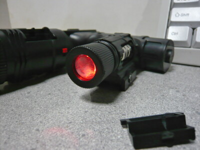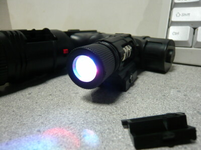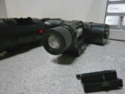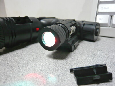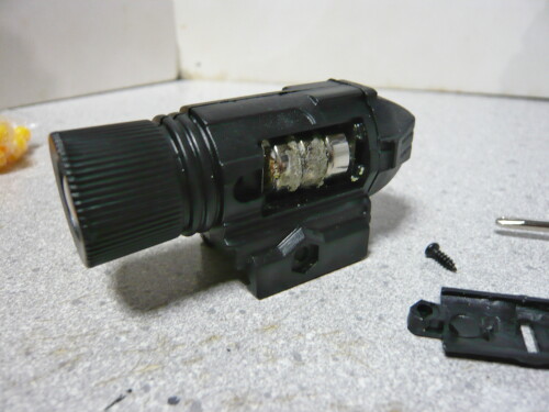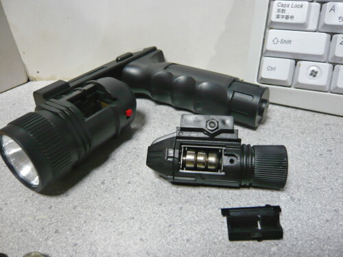 適当に余ってるライトからLR44電池を持ってきて投入。このフォアグリップ付きのライトはGYFのAKパラトルーパー付属のだったかな?ライトはめっちゃ輝度がありますがレイルへの取り付け固定が出来ず、スカスカに抜ける役立たず。