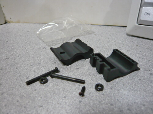 レイル上面とキャリハンの下面がピッタリ接するまで削ればきちっと取り付きます。上画像はトイスターM4A1カービンのものですが、金属パーツの仕上げがやや残念な以外は色も黒いしピッタリ。リヤサイトや調整部分はプラ製ですがライブ可動なので軽いし実用的。レイルへの取り付けはネジを緩めて上から斜めに載せ、もう片側をガチャリと掛けてネジを締めるだけ。便利。