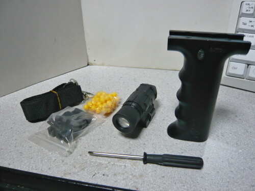 付属品。簡易なスリング、クソ品質BB弾、ライト、ライトの取り付けパーツ、フォアグリップ、プラスドライバー。