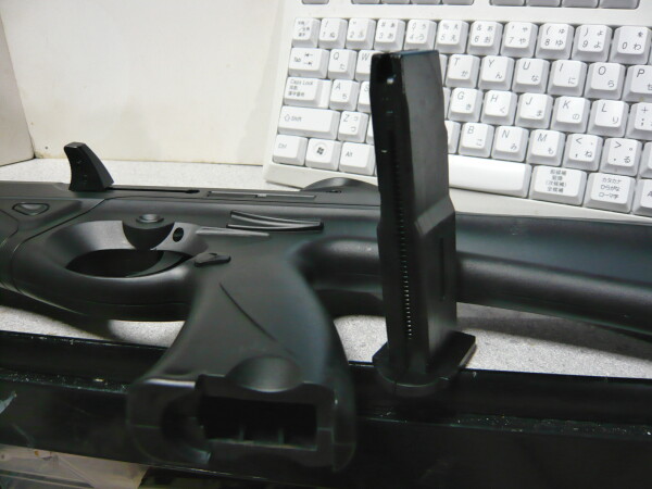 マガジンはグリップ底から入るハンドガンタイプ。実銃ではM92系と互換があります。マガジンキャッチを押すと1cmほど落ちてきますがストンとは来ません。リザーブタイプではなくただのストレート単列で後ろ半分には重りが入っています。